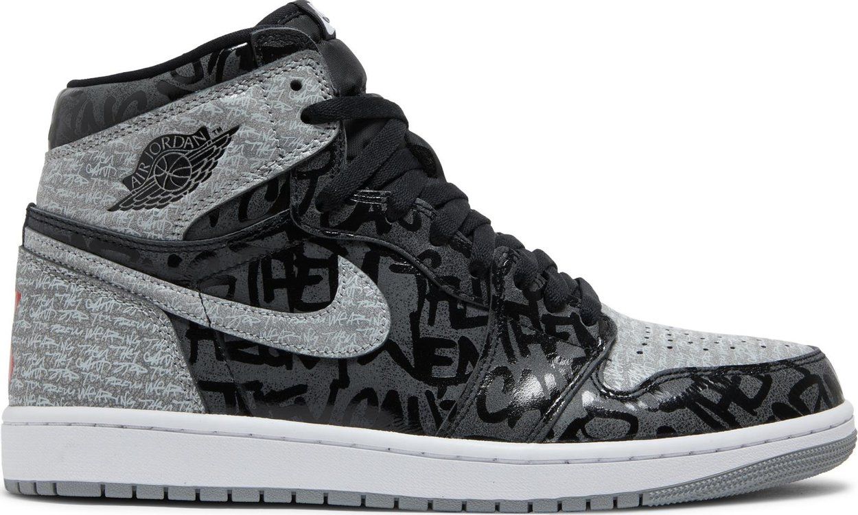 Vestido com uma mistura de preto, branco e cinza partícula, lembrando o clássico colorway “Shadow” . Este Air Jordan 1 é detalhado com uma parte superior coberta de texto que diz “Eles não podem impedi-lo de usá-los”, fazendo referência ao comercial, e o icônico “X” vermelho retorna nos calcanhares. Uma entressola branca no topo de uma sola de borracha cinza completa o design.